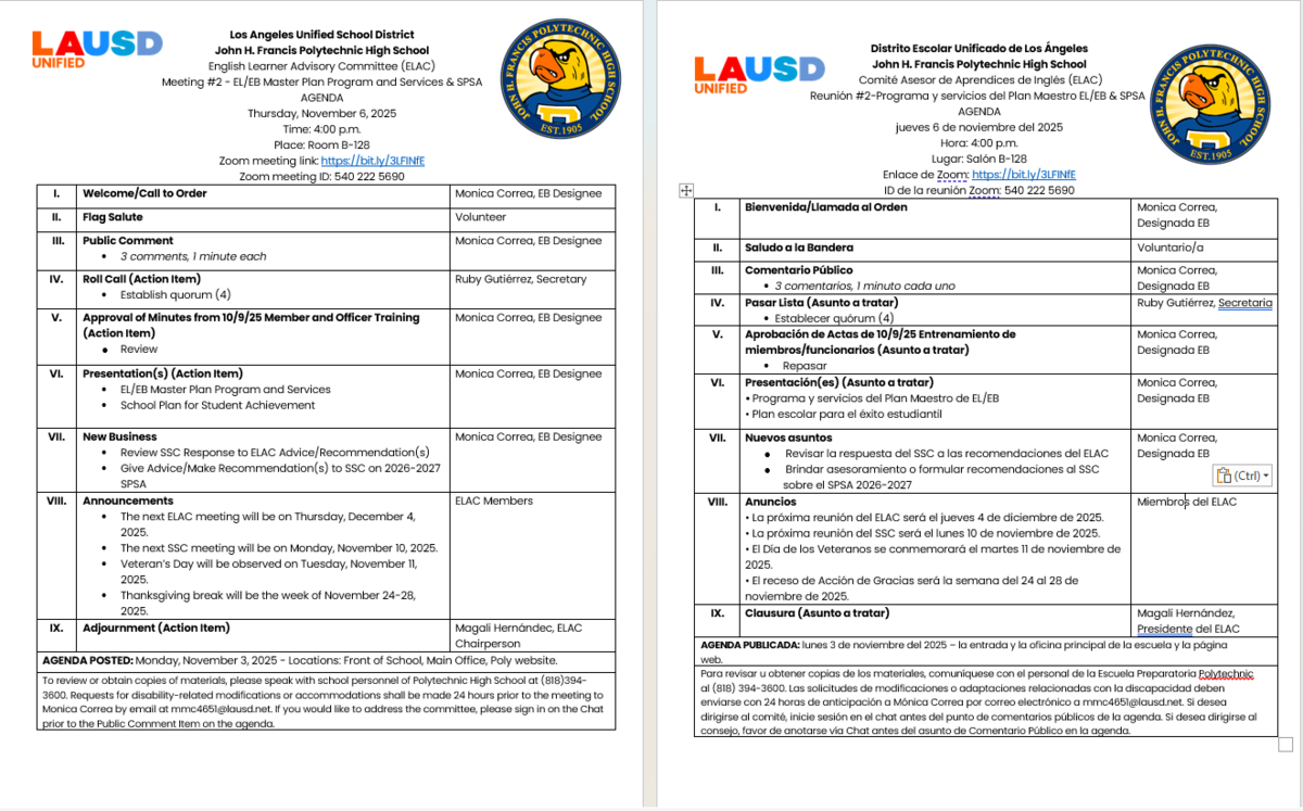 English Learner Advisory Committee (ELAC) - Thursday, November 6, 2025 https://bit.ly/3LFINfE Attached Files 2025-2026_ELAC_Master Plan and SPSA Eval bilingual 11-6-25.pdf Published November 3, 2025 Print