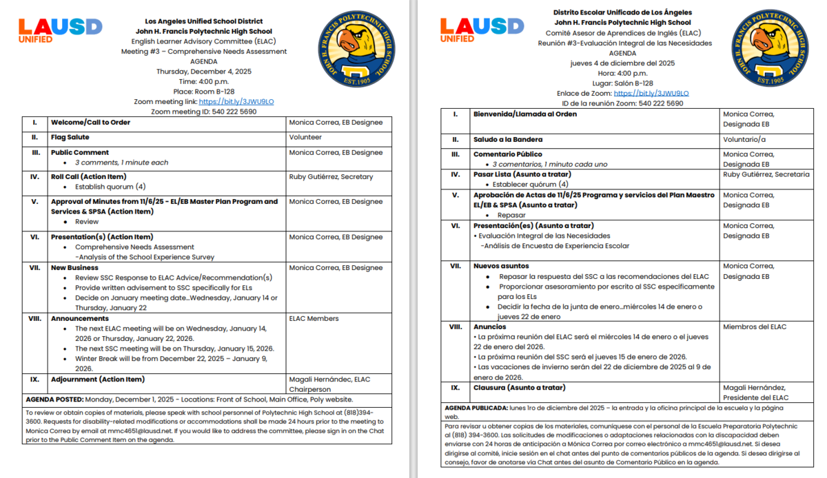 English Learner Advisory Committee (ELAC) - Thursday, December 4, 2025 Zoom Link Attached Files 2025-2026_ELAC_Comprehensive Needs Assessment Agenda 12-4-25.pdf Published December 1, 2025 Print
