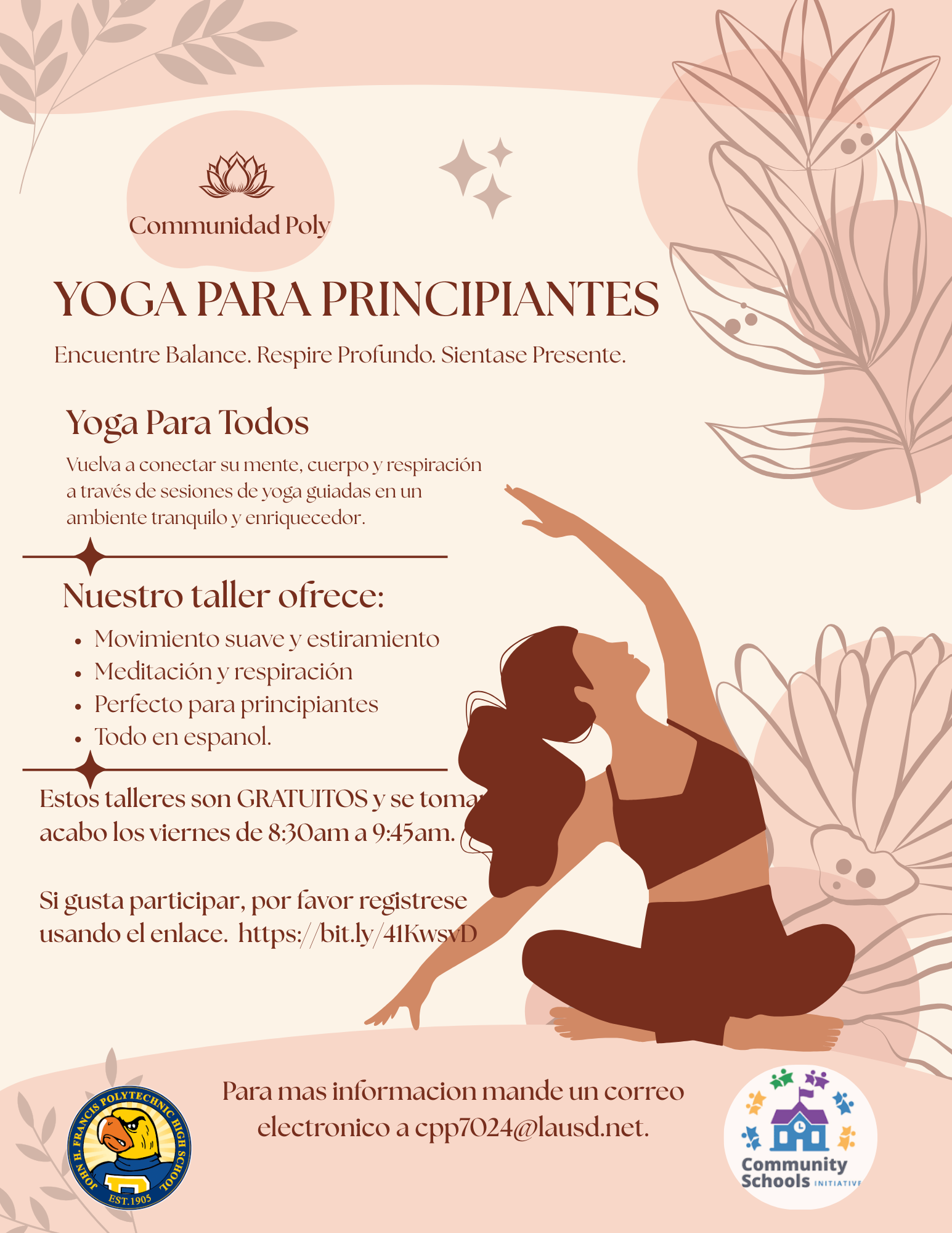 Poly ofrece clases de Yoga para principiantes en español para que nuestras familias tengan un lugar donde puedan aprender acerca de los beneficios saludables del balance, respiración profunda y estiramiento. Las clases son gratis y dirigidas en español los viernes de 8:30am a 9:45am. Nosotros proveemos el tapete de yoga (mat) solo necesita registrarse usando el enlace https://bit.ly/41KwsvD. Si tiene preguntas, por favor comuníquese con Ms. Padilla al (818) 394-3626 or [email protected].