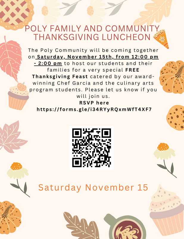 The Poly Community will be coming together on Saturday, November 15th, from 12:00 pm - 2:00 pm to host our students and their families for a very special FREE Thanksgiving Feast catered by our award-winning Chef Garcia and the culinary arts program students.